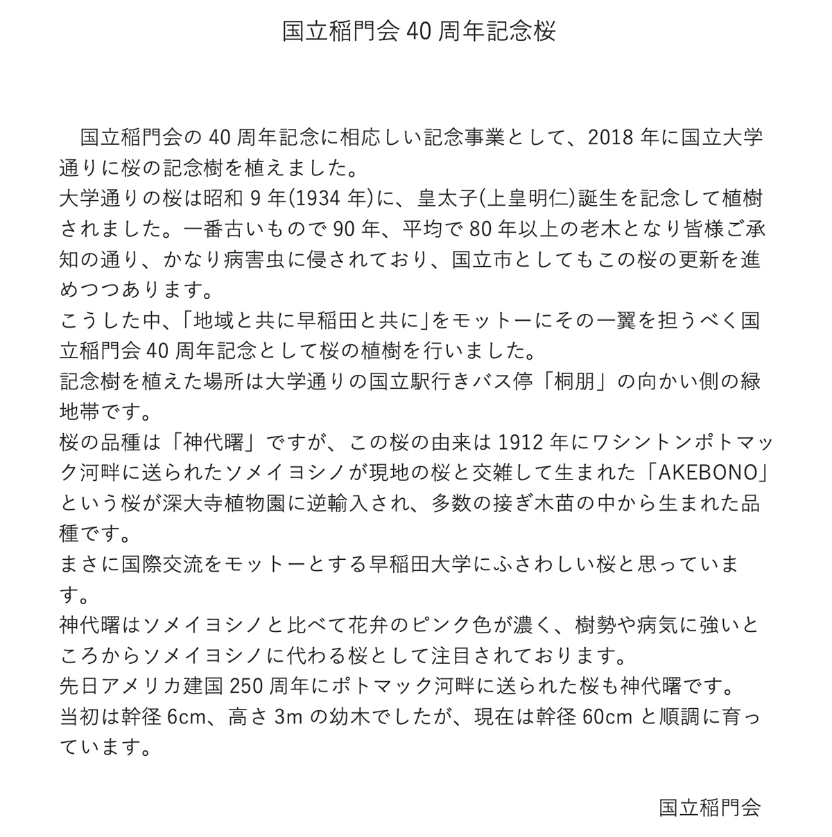 国立稲門会の40周年を記念して植樹されたジンダイアケボノは、幹径が60cmとなりたくさんの花を咲かせていました。